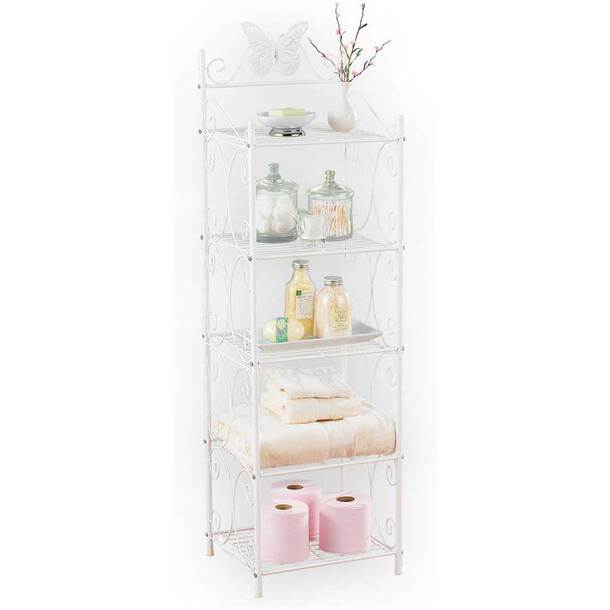 Airy and light in purest white, this charming 5-shelf storage unit demonstrates the gracefulness and useability of wrought iron craftsmanship.