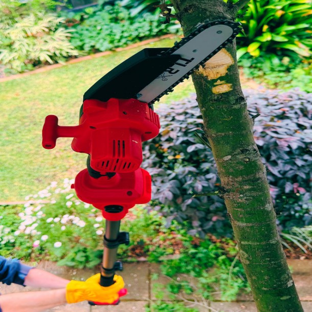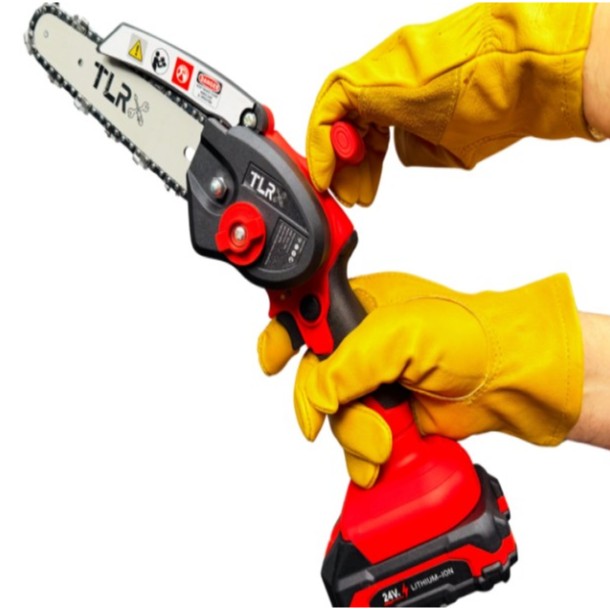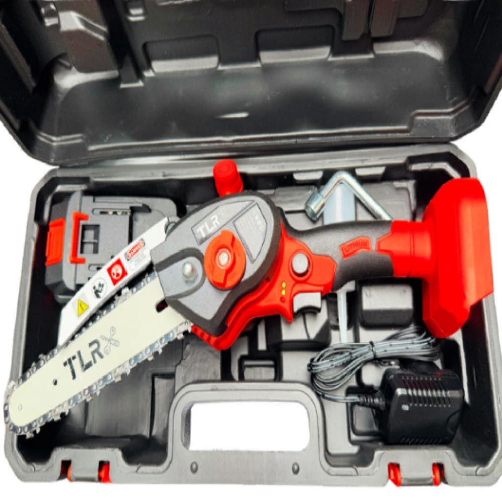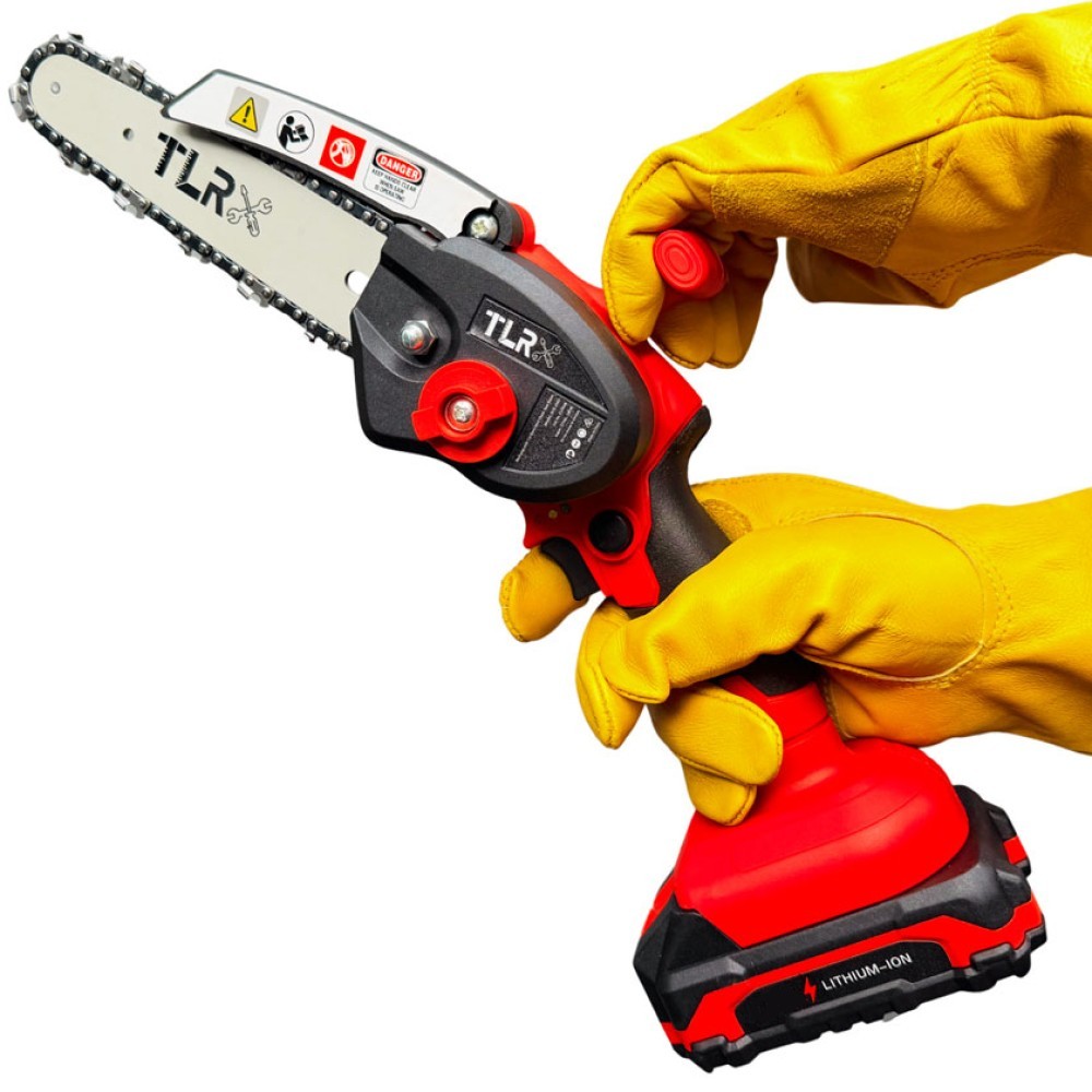 This Cordless Mini Chainsaw delivers powerful, controlled cutting through branches, shrubs and small logs up to 150mm thick with its fast-running 6-inch manganese-steel chain, giving you full chainsaw performance in a compact 1.5kg one-handed design.